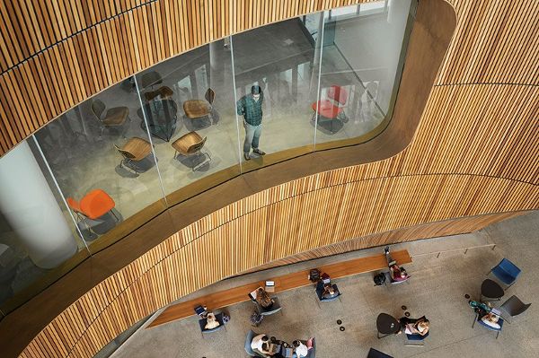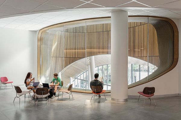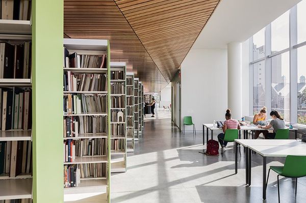 图书馆的设计确保了学生的技术需求,采用全移动技术策略,提供笔记本电脑和便捷的收费银行。40多个会议室和学习空间都是可预订的,图书馆在提供适合学生新需求的课程的同时,也提供了传统学术型图书馆专注的研究体验。宁静、充满阳光的四楼鼓励游客漫步于图书馆可浏览的藏书堆中。两个宽敞的阅览室平衡了这层楼的南北两端,四面都是玻璃,可以欣赏到茂盛的绿色屋顶。