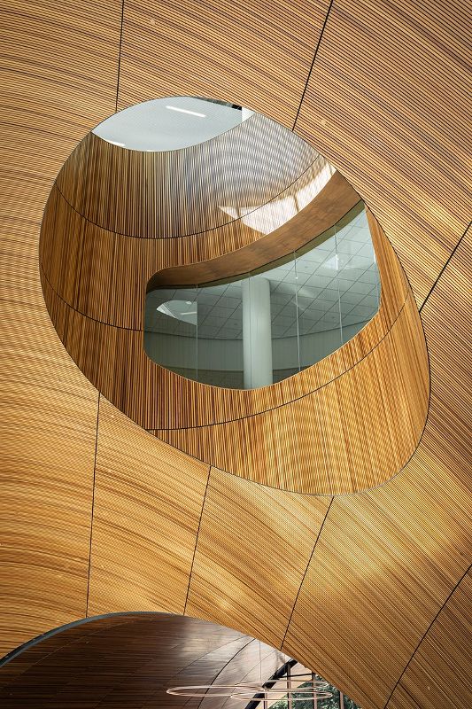 在内部,大堂的圆顶中庭可以看到大楼的每一个角落,它作为一个导航锚,将用户放在图书馆活动的中心。雪松覆盖的圆顶上雕刻了一个眼睛形状的孔洞,允许光线从最上面的楼层进入大堂。一进入口便可以看到一个钢结构的楼梯,它突出建筑的流通性,邀请人们向上行走。当人们在建筑物中行走时,这种视觉和物理上的连接使他们能够保持方位感,并鼓励他们使用建筑里的所有资源。