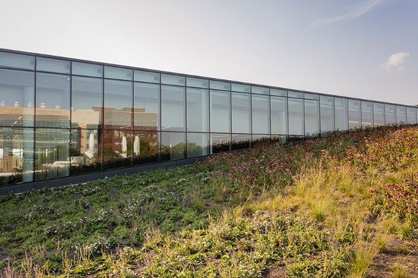 47300平方英尺的绿色屋顶覆盖了该建筑70%以上的屋顶表面,是宾夕法尼亚州最大的绿色屋顶之一,在该建筑的雨水管理系统中发挥着关键作用。查尔斯图书馆场地的设计是为了最大限度地收集和保留雨水,包括绿色屋顶,地面可透水的广场和道路,可渗入雨水的园景种植地,以及两个地下集水区,在暴雨期间可以一起储存和处理近50万加仑的水。
