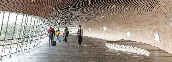 室内装饰采用有规律的木质覆盖层和线性嵌入式照明,行人天桥引导游客沿着发光和起伏的轨迹前行。与之形成鲜明对比的外部由穿孔钢板覆盖,加上Zambelli肋屋顶和Baumetal的设计,与周边基础设施系统的材料相匹配。