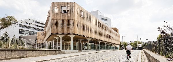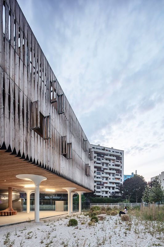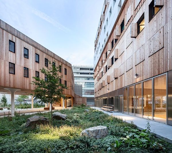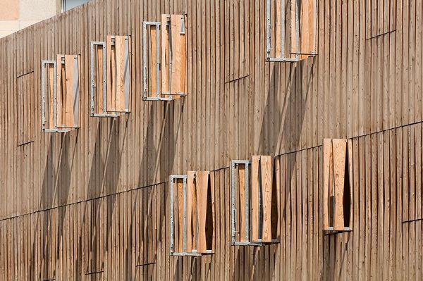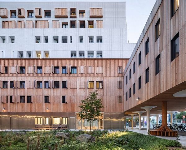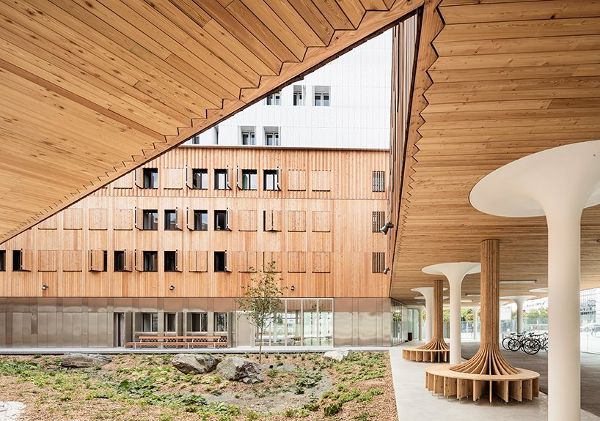 在设计立面时,建筑师们试图在构成该地区各层的各种建筑原型之间建立一种联系。该建筑的一侧面向“巴黎国际大学”,与La Maison Des Arts Et Métiers互动,旨在通过创建由各种水平层组成的立面融合为“Faubourg”式建筑。以玻璃为基础的地面提供了轻盈的感觉,接着是三层落叶松木复合地板,最后一层由钻孔铝板组成。