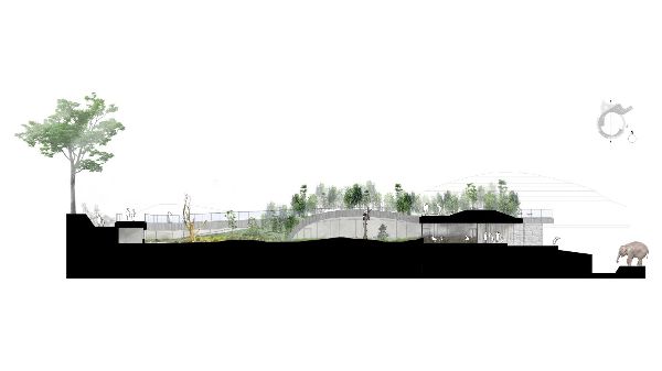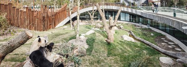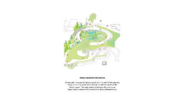 封闭空间被升高以形成地下的厩和其他设施,同时将它们隐藏并整合到景观中。通过在阴阳符号的两端抬起大地,形成起伏的景观,让人们可以直接看到熊猫的栖息地。同时,栖息地中遍布的各种植物、岩石、攀援树和树干,使熊猫可以在公众仍能看到的情况下撤退、休息、进食或寻找树荫。夏季,盆地、溪流和瀑布等各种水元素都可以为大熊猫提供丰富的生活和凉爽的生活。