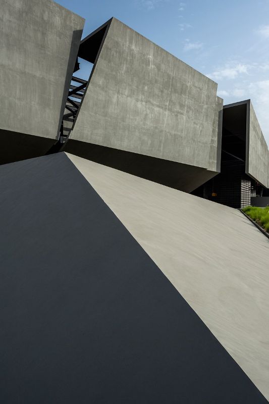 该建筑在其外部雕塑空间中结合了水泥和黑玻璃,而由十多个钢结构组成的多头钢屋顶则包裹并连接了“石头”碎片。同时,巨大的黑色窗户与不同的碎片融合在一起,在“盾牌裂开”之间呈现出黑色的斑纹,进一步将所有内容连接在一起。在内部,运营功能和相关空间之间保持着持续的平衡,探索了一种在办公环境中的新生活方式,在办公环境中,人与人之间的协作是项目的主要焦点之一。内部走道被想象成与不同建筑碎片相交的车道,这些碎片代表了设计用于容纳各种功能的“集群”。