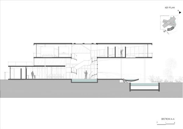 房子的平面图由两个部分组成:十字形和圆形。十字形被圆形包围,圆形包含工作室、游泳池和录音室等空间。十字结构是建筑的主要组成部分,在一楼由支柱连接。在这些柱状物中,包含了更多的社交空间,包括厨房、生活区和餐饮区。得益于开放式结构,该区域创造了连续的景观,形成了房屋的中心,并与周围的自然环境无缝融合。