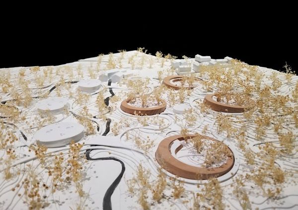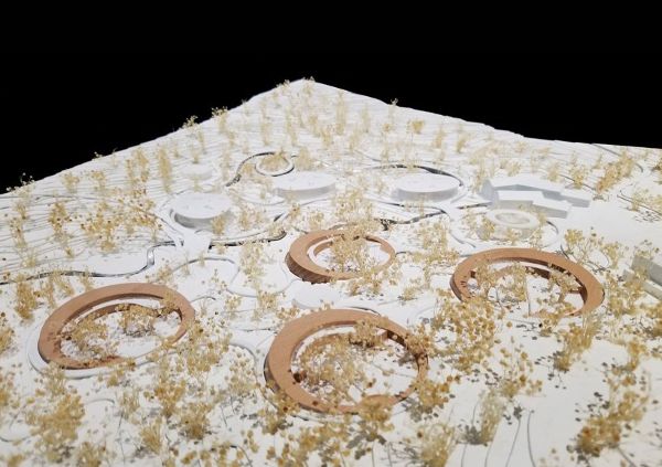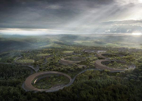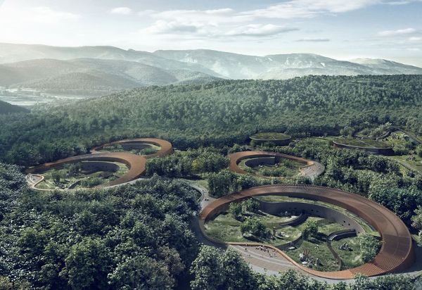 四个展馆都是圆形的,有一个大的露天庭院,作为熊猫的户外游乐场。受成都大草原的启发,这一造型由EID建筑事务所设计,创造出一种自然、有机的建筑,依偎在景观中,融入到国家公园的地形中。