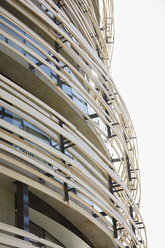 考虑到该项目的特殊情况,设计团队选择了一种无方向性的建筑形式,可以从各个角度进行探究。圆形形式激发了达令广场社区的活力,并吸引了众多用户,建筑的木质外壳使住户有着亲近自然的感觉。有机的木质屏风包裹着移动的地板,这个由木条组成的屏风过滤了自然光线,为室内空间提供了柔软的质感。该团队以一种有趣而原始的方式将建筑表现为自然元素的一部分,如树或“巢”。