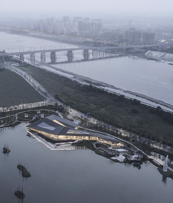 在为书院开发设计时,XAA试图通过寻找一种坚固的山脉形式来让人们了解文学之神。屋顶不仅为建筑提供了鲜明的特色,而且在室内和室外之间形成了过渡空间,这要归功于深处的垂悬点延伸到地面。大型天窗和周围的玻璃幕墙也使自然光涌入整个室内。此外,由于玻璃幕墙的使用,建筑如同漂浮在湖面之上。