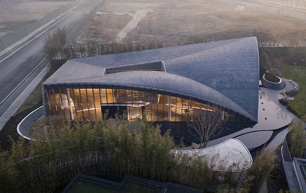 这些功能是围绕一个封闭的中庭空间布置的,有点像中国传统建筑。建筑体量的一角俯伏在水面上,延伸到周围的景观中,通过强调天地之间的统一性来代表古代中国文化,同时赋予建筑一种轻盈而动感的外观。外立面设有巨大的落地玻璃窗和许多长长的幕墙柱,类似于传统的木质格栅,实现了室内外环境的视觉连接。