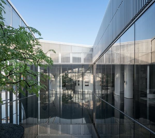 屋顶覆盖着中国南方常见的石板。这种材料的选择彰显了江南简单而优雅的建筑语言,而自然的质感与轻巧透明的玻璃幕墙形成了有效的对比。主立面为不锈钢柱,为降低施工成本,对立面进行分段。在这些部分中,已安装了不锈钢穿孔板,以使外观更加精致。