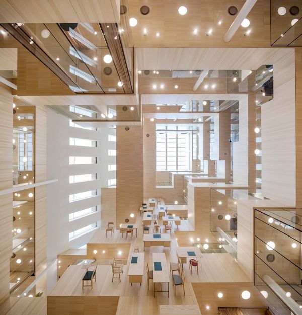外立面是一个模块化的系统,具有水平线、垂直线和对角线,从整体和细节上创造了一个单一的体量。Studio ALL通过石材的不同角度可以捕捉光线并投射阴影,以实现不断变化的光线。室内墙壁和天花板上都使用浅灰木地板。统一的木质衬里营造了一种温暖的、斯堪的纳维亚式的家一般的感觉,并结合了基于新工作方式的办公室布局。这样,家庭工作区便被引入到办公室。
