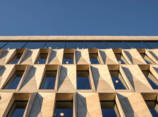 新建筑采用倾斜的立面,与现有建筑物的屋顶相似。创造了新旧建筑之间的统一,新建筑物的外墙采用了棕褐色的Jura Gelb石材,进一步强调了统一性。新建筑的颜色类似于旧市政厅的颜色,而石材图案类似于国家银行正立面的颜色。