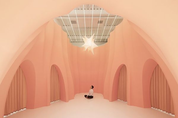 入口大厅的墙壁是拱形的,形成了一个圆顶状的空间,其弧形框架与上面暴露的现有工业天花板形成鲜明对比。它们的凹槽表面参考了古典柱式的建筑细节。大厅中央悬挂着定制的星形吊灯,固定了空间。它提供柔和的光线,轻柔地照亮内部,欢迎游客进入其温暖明亮的室内。