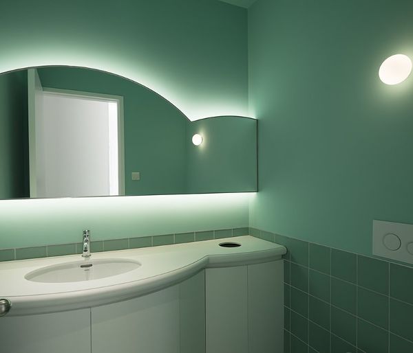 用餐区的设计让人想起展览空间的感觉。照明和镜子安装在经典的相框中,相框沿着墙壁排列,类似于一个艺术画廊。带淋浴的化妆间位于隔壁,具有古典细节。