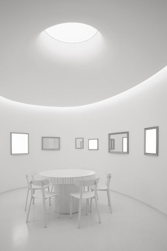 接待区是一个白色的房间,与橙色的入口大厅相得益彰。它的特点是设计更为拘谨,由直角组成,起到休息室的作用。摄影棚采用的是更传统的设计——白色的两层通高空间,通过拱形切口在视觉和空间上与二楼工作区的阳台相连。窗帘用于分隔房间,提供功能上的灵活性,允许在需要时与入口大厅一起使用。