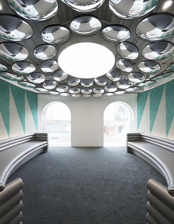整个二层都面向VIP,主要项目是圆形休息室。墙壁上覆盖着一层奢华的织物,被切割成醒目的图形形状。定制的沙发横穿整个房间,可提供充足的座位,而视线则被向上吸引到天花板上安装的凸面交通镜上,这些镜子构成了房间的焦点。