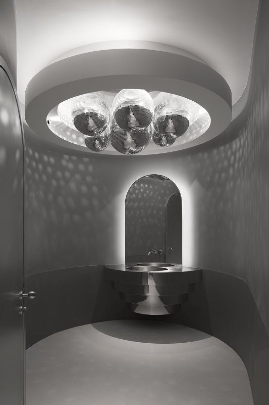 化妆室旁边是一间狭长的超大浴室。银色的色彩和反光品质是整个房间的灵感来源,上方安装的镜面球为空间增添了另一维度。银色的色调还与新的拱形立面有关,有效地统一了内外建筑的表现形式。