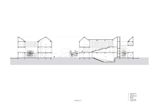 寿县文化艺术中心建在老城区东南两公里的一块空地上,由多个大小不同的庭院组成,这些庭院被放置在一个相对封闭的矩形体块中。庭院之间由蜿蜒起伏的人行道相连,形成一个不受阳光和雨水侵蚀的公共环路。主入口的一个宽敞的庭院形成了一个公共广场,代表典型的寿县民居的中央房间,而更多的私人区域则受到当地住宅中私人花园的启发。