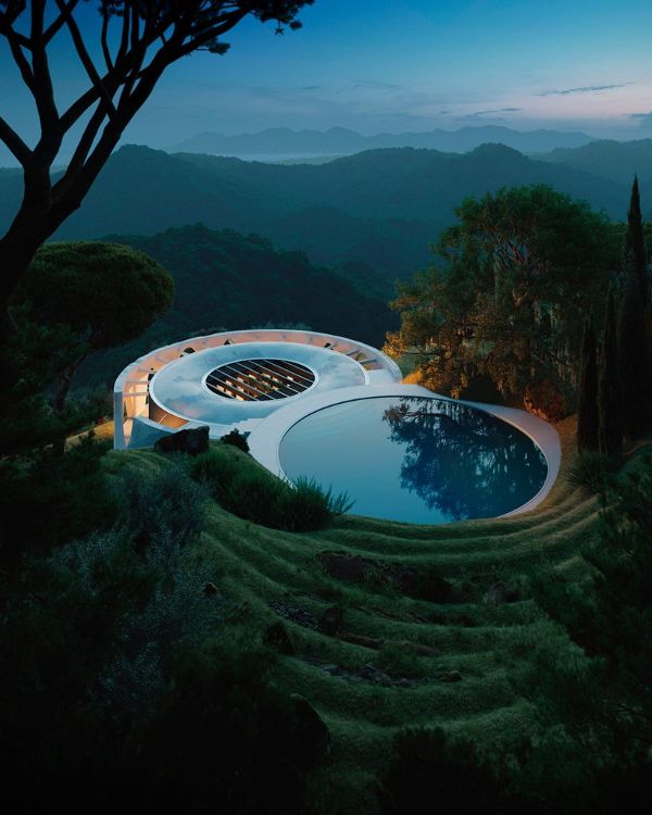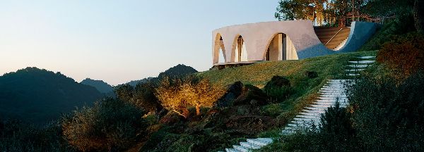 波兰建筑设计师Bartosz Domiczek设计了“亨格山房子”,这是一栋建于历史农场仓库遗址上的住宅。其放射状平面和宽阔的拱廊定义了原始结构的破败外壳,这是住宅的基础。该项目富有纪念性地面向遥远的山坡上的橄榄林,表达着弧形拱廊外立面仿古石材的质感。在设想中,该外壳被部分修复后,可用作内部新组织的房间集合的锚点。
