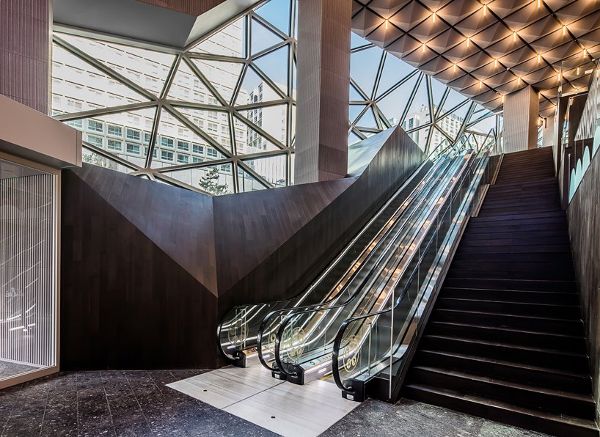 新广场被高耸的住宅塔楼环绕,与现有的城市环境形成了鲜明的对比,这得益于玻璃和石材在立面上的动态运用。纹理马赛克石立面由OMA设计,为了唤起邻近水原光谷湖公园的自然风光,创造了一种近乎乳白色或大理石般的纹理。穿透这个空间是多面玻璃的一个重要元素,这给了建筑一个有机的品质,同时也给了路人一瞥百货商店的内部的机会。