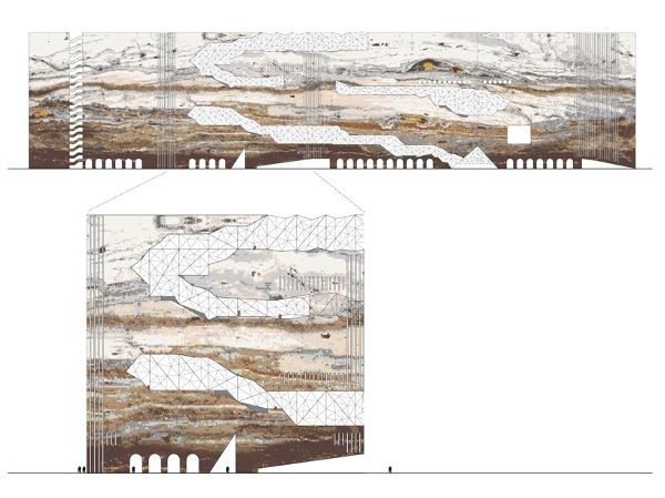 除了可以打破大块石材的不透明性之外,多面玻璃还可以作为一条连接人行道和屋顶花园的公共通道,屋顶花园可以举行零售和文化活动。透过玻璃,室内的空间可以向城市的过路人进行展示,而在室内的游客可以在Gwanggyo享受有利位置。这个公共环路由一系列层叠的阶梯组成,为展览和表演提供了空间。