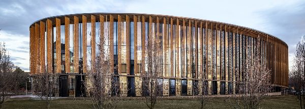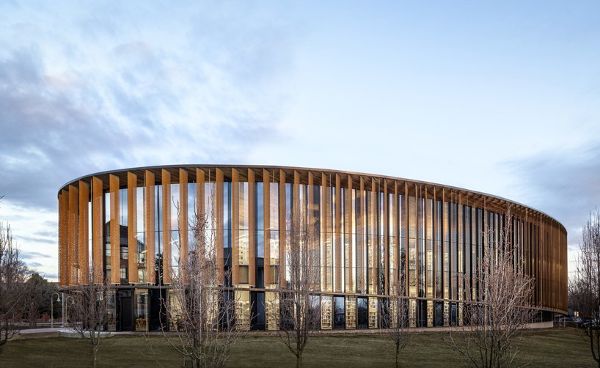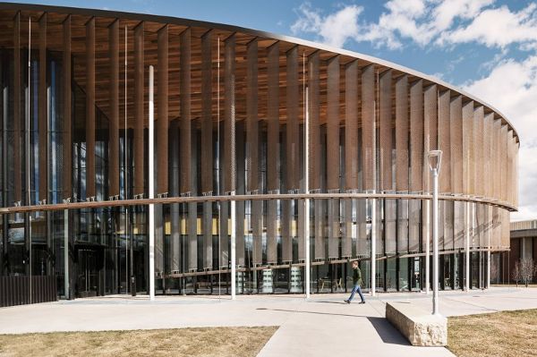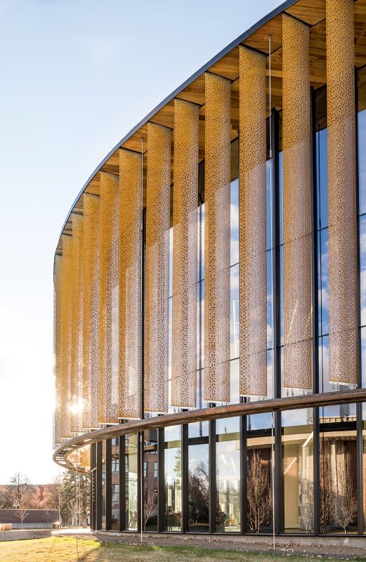 Richard Kennedy建筑事务所设计的Cruzen-Murray学术图书馆位于爱达荷州大学,是一个椭圆形的玻璃建筑,由一系列穿孔的金属遮阳板遮挡,这些遮阳板围绕其圆形空间旋转。遮阳板的布置方式可以在一天和一年中的适当时间向内部空间提供充足的自然光,从而营造出充满阳光的宜人环境,为参观者提供充足的外部视野。同时,在傍晚时分,这座建筑就像校园里一盏发光的灯笼一样,从内部明亮的天花板上发出柔和的光线。