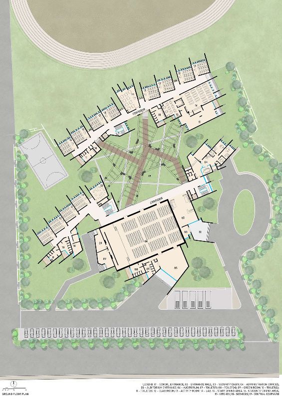 礼堂、小学和行政管理空间位于该地块的南侧,中学教室、图书馆和自助餐厅位于庭院的对面。整个学校都朝着一个多功能操场和北边的田径跑道开放。在整个设计过程中,斜墙充当遮阳板,以减少来自东、西和南面的热量,从而使内部空间更凉爽。