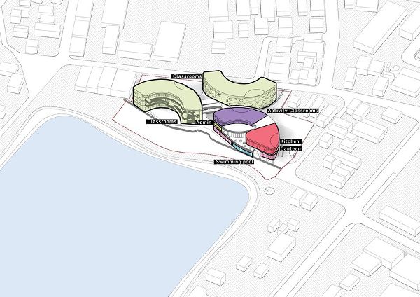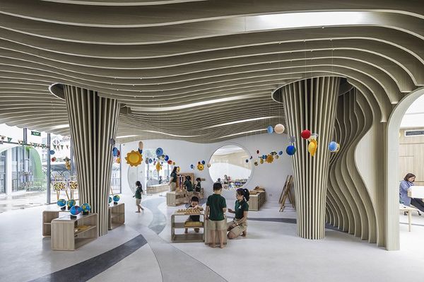 “设计语言——有机的形状、简单的建筑线条、原色、按年龄划分的不同立面/窗户——这些都关乎到了儿童成长,对儿童友好而又不幼稚。” LAVA董事Chris Bosse评论道,“一个面向下一代的教育项目向我们提出了挑战,让我们质疑自己的教学方式。我们创造了一个新的学习环境,鼓励发现、好奇心、与自然的互动和以活动为基础的学习,以促进儿童的全面发展,而不是一个有老师在前面,孩子们排成一排听课的方式。这一愿景是通过一种基于自然及其结构几何的设计语言实现的,这种设计语言激发了人们对世界的有趣探索。”