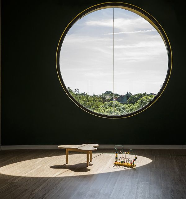 在EcoKid项目众,LAVA将建筑与周围城市景观结合起来。弧形造型可以最大限度地欣赏邻近的湖景,同时将室内空间与每个不同的庭院连接起来。以原色装裱的多个圆形镂空窗,它们的高度和尺寸各不相同,反映了不同年龄段的需求。白色背景上对比强烈的窗框颜色使其成为可以吸引孩子们的地方。