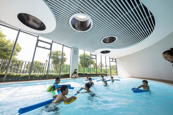 EcoKid的建筑结构形成三个庭院,中间有一片森林,将空间与自然连接在一起。室外空间的建筑理念根据风水五行而定——金、木、水、火、土。这些室内和室外操场,还有体育中心和游泳池,能够促进孩子们的身体发育,并使孩子们形成健康的生活方式。