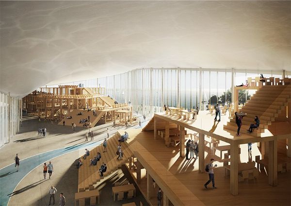 MADMA的提案获得了Mecanoo设计的亚军,该提案将项目的主要学习设施设置在北部,生活和娱乐设施设置在南部。学习设施包含在交叉层压木材建筑模块中,包括主教育中心、接待馆、运动厅、餐厅、图书馆和创意馆。从这里开始,一个巨大的楼梯向着湖泊延伸,在湖边的公共广场上可以看到一个漂浮的舞台。