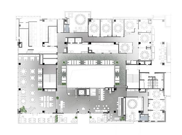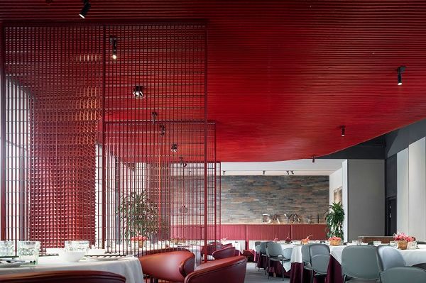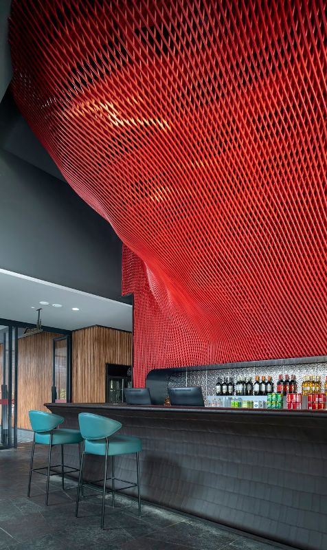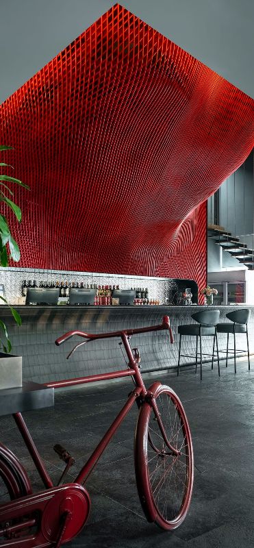 天花板表面用红色金属藤条编织而成,营造出引人注目的景象。除了作为装饰之外,金属格栅还可以隐藏建筑物的功能。红色藤条贯穿整个空间,在不同的空间之间提供了连接元素。不过,为了平衡这种红色色调,室内也采用了烟熏黑的仿古砖墙和地砖。