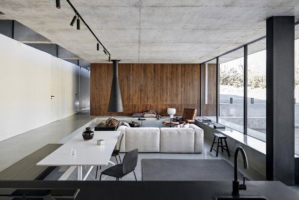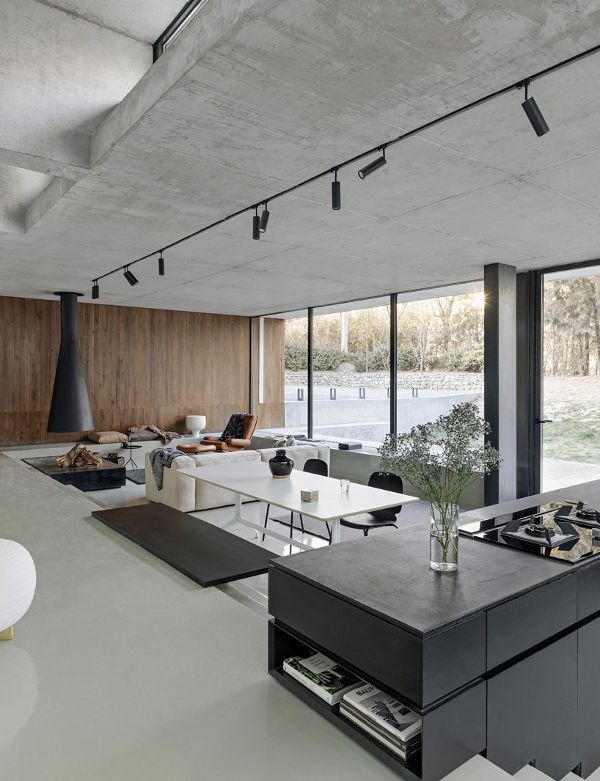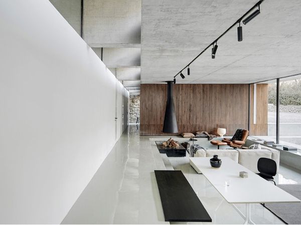这个设计充分利用了现有石墙、混凝土屋顶和隐藏车库。这些元素与两个屋顶板的位置偏移组合在一起,创建了许多间隙和空腔,允许灯光从多个点进入。实际上,光是从四面八方发出的、从清晨到傍晚不断变化的。北立面的大窗户为客厅提供了漫射光线,光线通过屋顶之间窗户的反射变得柔和,光线在白色分隔墙上反射到卧室,并以较柔和的强度到达客厅。位于房子不同部位的开口都接收不同亮度的光线,并像演奏交响乐的不同乐器一样不断地散射出新的光线。
