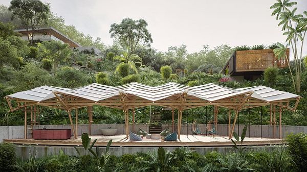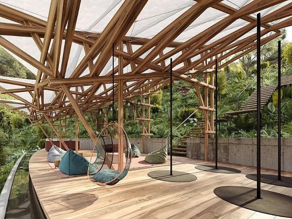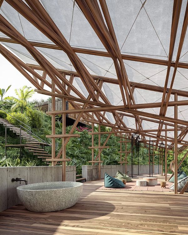 “Wing”位于山坡下方,是一个水平平台,有一个独特的屋顶天篷。这部分方案的效果图展示了不同的休闲和分享体验区域,包括豆袋、吊椅、石盆和室外厨房。Designboom之前曾报道过该度假胜地的其他两栋住宅-“Art Villa”和“Atelier Villa”。