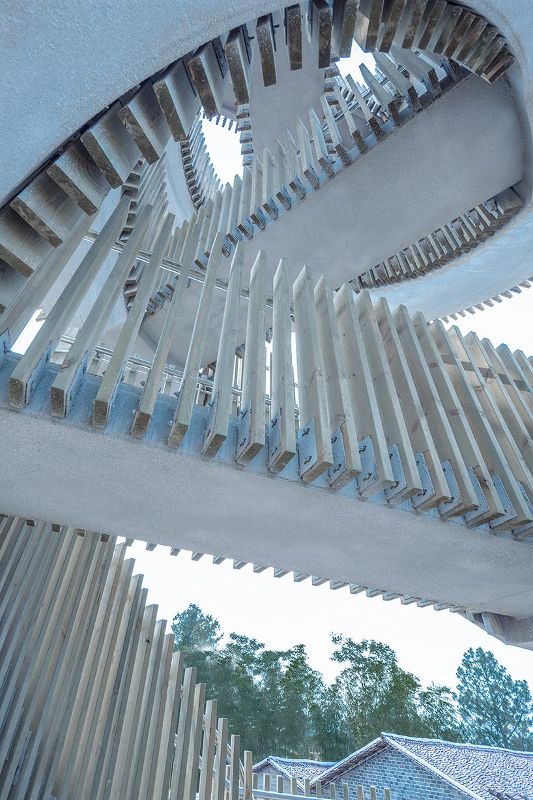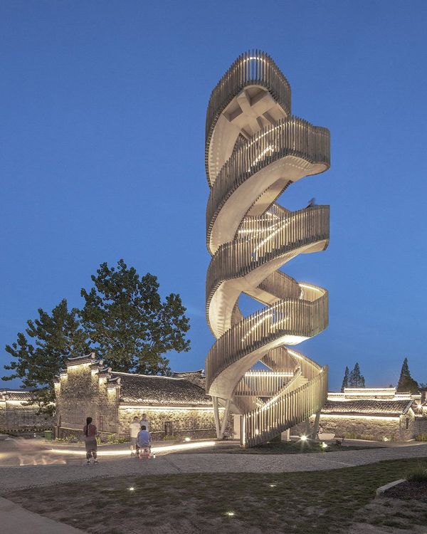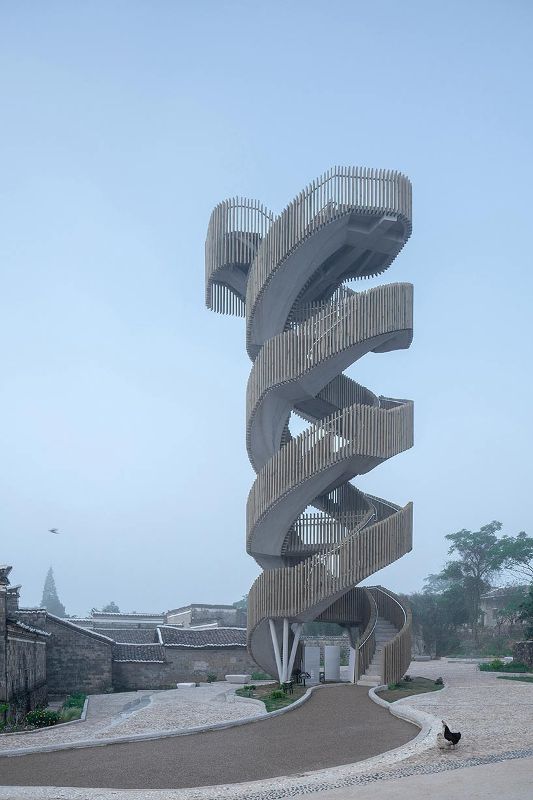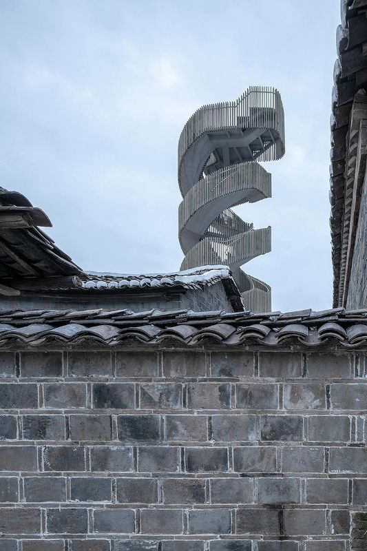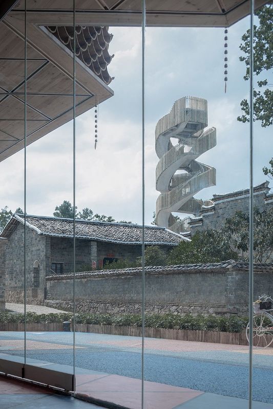同时,两个新的建筑构成了规划的一部分。一座钟楼,灵感来源于古代用于防御的观测建筑,由两条相互缠绕的路线组成——松散地如同一个巨大的中国“龙柱”。这座塔楼可以俯瞰村庄和周围的景色,是社区的新地标。在规划的其他地方,个新的公共大厅的设计参考了村里的百年香樟树,这里几十年来一直被用作聚会场所。大厅的陶瓦外墙允许鸟类在其中筑巢。