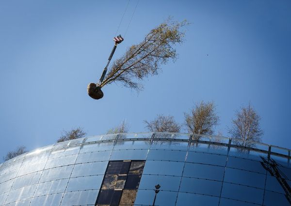 MVRDV在其“Boijmans van Beuningen艺术仓库”的屋顶花园上栽植75棵树,这是世界上第一个公众可进入的艺术仓库。该项目于去年年底落成,位于荷兰的城市鹿特丹。在接下来的两周内,这些大型桦树将被举起超过30米并种植在屋顶上。这些树木将成为环绕餐厅的绿色森林的一部分,并构成整个城市的景观。设计团队选择的桦树可以生长到大约10米高,对该地区的天气条件有很强的适应力。