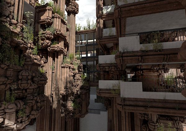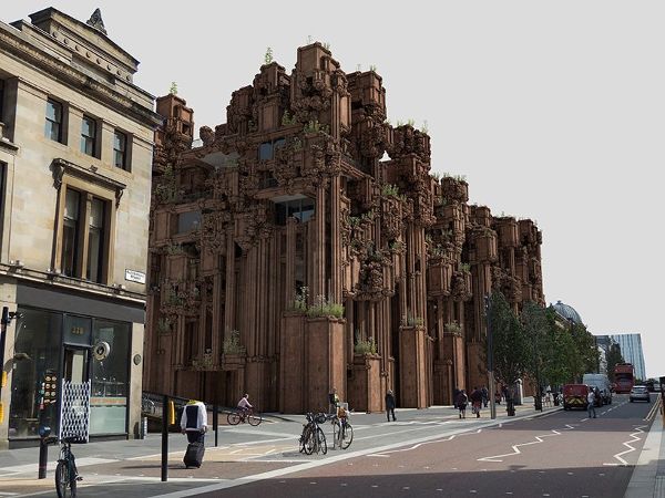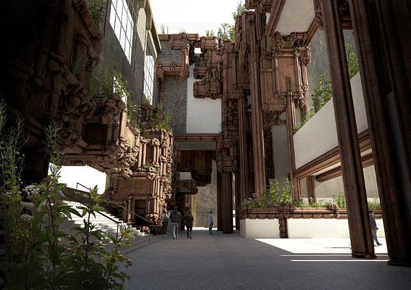 该扩展区包括工作室空间以及专门为植物殖民化保留的区域,目的是将荒野的概念引入城市。建筑的立面的特点是其折叠的几何形状,每个元素上都有多个接缝。这种复杂的几何形状的存在是为了鼓励风吹散的种子繁殖出植被。其结果是植物以一种狂野而不确定的方式生长,这一假说受到城市悬崖假说的启发,该假说预测,城市中大量的自发定殖生物起源于稀有且地理边缘的岩石露头栖息地(Larson等,2004,通过Urbanhabitats发表)。