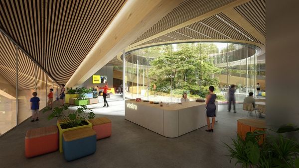 在设计这个项目时,BIG试图通过弥合森林环境、透明度和制造业之间的差距来重新设想工厂的类型。顾名思义,“The Plus”是一个十字形结构,中间有一个交叉点作为室内的“环形交叉口”,这个交叉口有效地处理工厂内的所有物流交通。从一楼的购物广场登上一条彩色的楼梯,就可以通向Vestre办公室和展览中心,办公展览中心位于生产设施的上方。