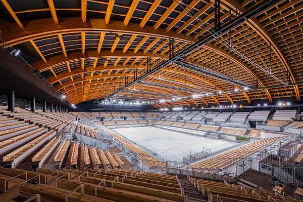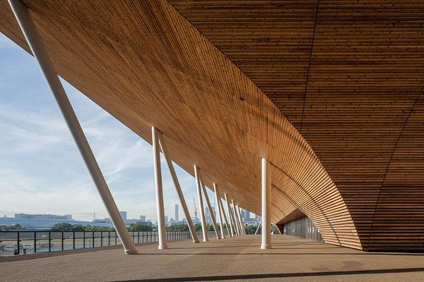作为“漂浮在海湾中的木舟”,木材被用于屋顶结构、立面、观众席和外墙。竞技场的天花板由一个木质框架支撑,旨在减轻整体结构的重量,而立面则考虑了建筑的隔音和隔热性能。NIKKEN SEKKEI解释说:“功能、结构和空间紧密结合,在保证丰富性的同时,设计简约而美观,这是日本传统木结构建筑的精髓,我们希望来自世界各地的观众和运动员都能感觉到这一点。”