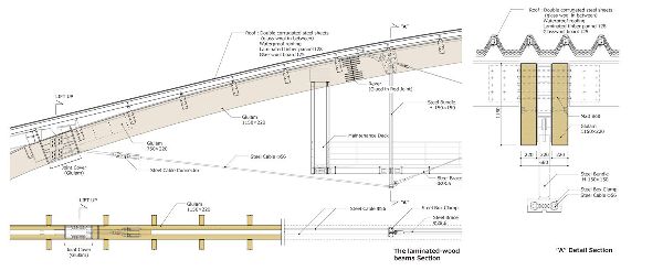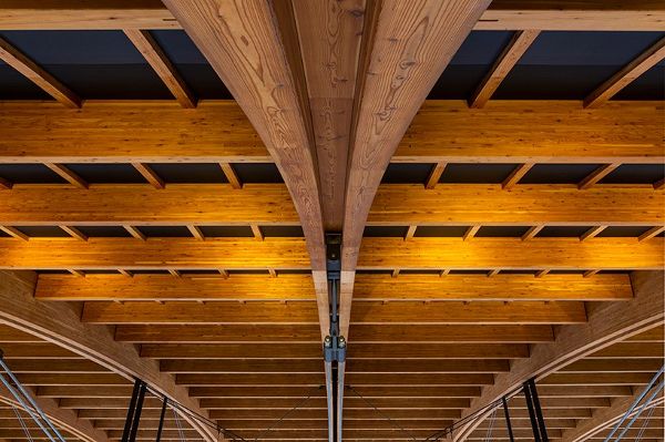 在建筑内部,胶合层压板木材允许跨越90米的无柱空间。设计团队解释说:“我们采用了一种简单的结构,即使用具有高热容的大型胶合层压板的单个构件,而不是由若干小构件组成的桁架,以保证耐火性能和结构的稳定性。”
