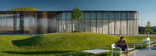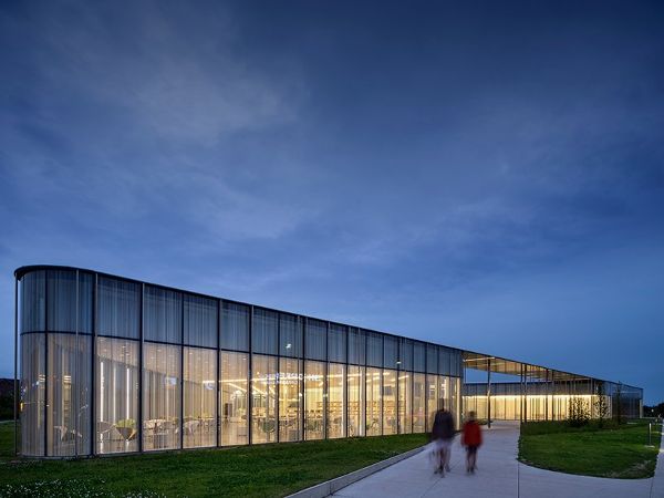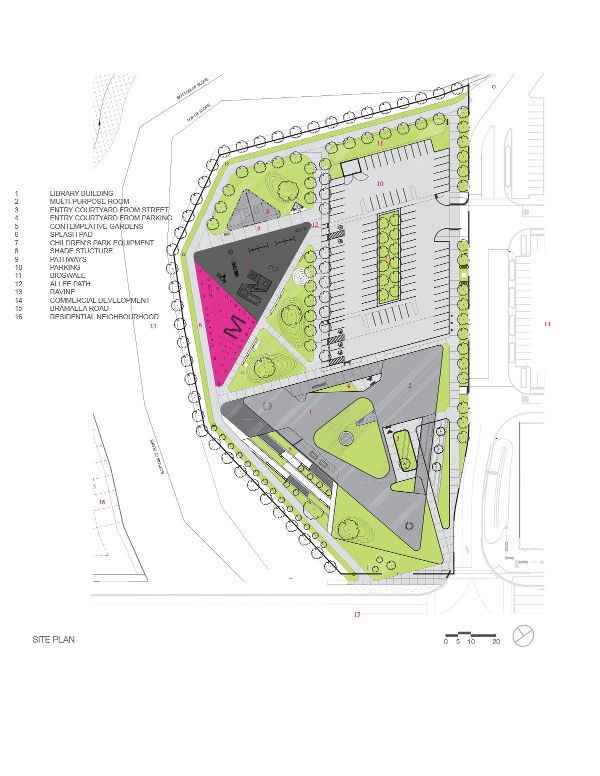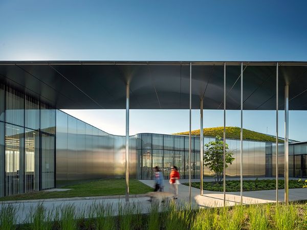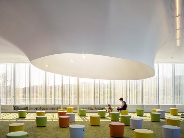 RDHA设计了安大略省的斯普林代尔公共图书馆,不仅引入了一座建筑,而且还建立了一个景观,从连接建筑物和庭院的有机形状周边开始,在流体形状的天花板和山丘状的绿色屋顶之间形成起伏的地形,室内倾斜的楼板和公园的平坦景观。公园由一系列供老年人使用的梯田式沉思花园,以及围绕“想象”一词组织的水花板和儿童游戏区组成。五米高的字母在水平面和垂直面上都有定位,成为孩子们探索的互动功能。