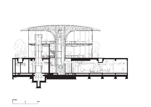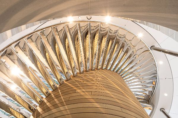 Foster+Partners解释说:“中心支撑由1461个欧洲白橡木型材组成,由温暖的木材包裹而成。橡树木材被分割成单独的薄片,并粘在云杉核心上以保持稳定性。每个板条上精心制作的边缘细节使空气能够通过吸声背衬层从中央结构中排出。”