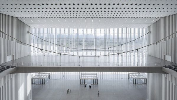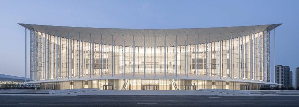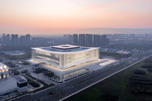 建筑工程的钢梁超出核心,形成屋顶的边缘。较低的半月形拱门悬挂在这座建筑上,形成了一个宽敞的入口。悬架采用了180根优雅的钢柱,长度在30到40米之间,直径为0.6米,为立面提供了动态结构和视觉焦点。从河对岸的角度看,从远处可以看到的内部明亮的白色半月成为了西安市的一个地标。
