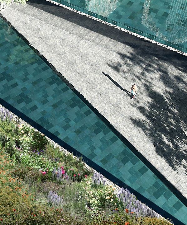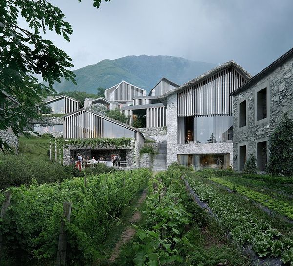 奥本海姆建筑事务所的团队将“Lago Maggiore”的第二个地点想象成一个植物园,提供了郁郁葱葱的森林景观。凉亭、果园和层叠的水池搭配上地中海的小气候,在温暖的阳光下,游客在四季都感觉很舒适。高出湖面近4000英尺,一个由隐秘的乡村别墅群组成的小村庄藏在板栗林中。这种由密集的建筑和森林空地组成的巧妙的设计,重新诠释了提契诺山镇的风土人情。在项目实施过程中,结合了当地工艺与最先进的技术,可以承受冬天的积雪。该项目的材料基础是当地开采的花岗岩、从废弃的谷仓和倒下的树木中回收的栗子,以及用区域骨料制成的灰泥。