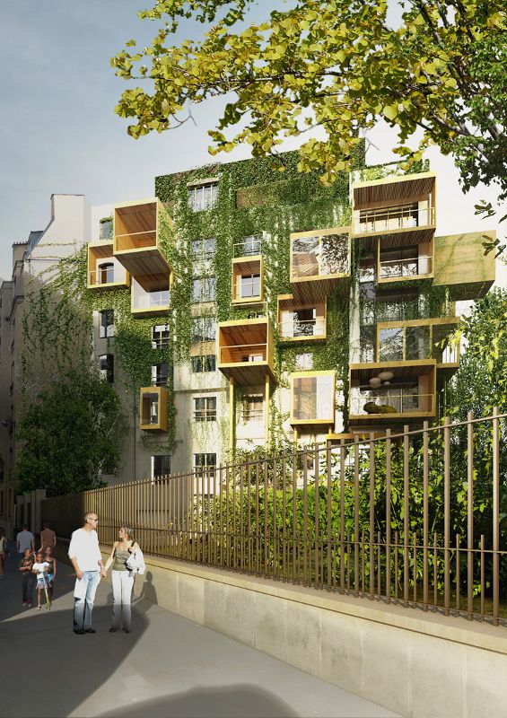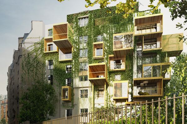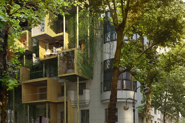 为了解决法律的限制,stéphane malka打算居住在立面上,在一层使用立方体盒子扩展住宅,同时从立方体盒子上悬挑出带有落地窗的空中花园,露台或者大小可变的凉廊。方盒子的结构由生物合成木料做成,实现了结构的轻质和现场安装的高灵活性。插入到现有建筑的立面,扩展部分累积起来将建筑物的能源消耗分为四部分,每一部分建筑复原所消耗的能量平均每两年45千瓦时。
