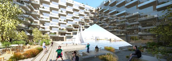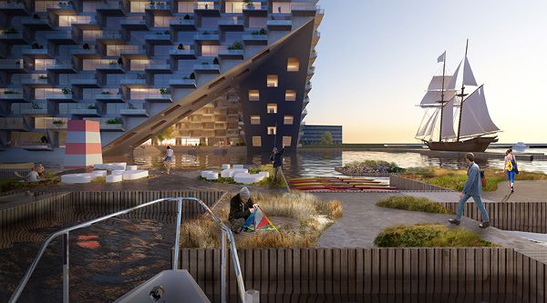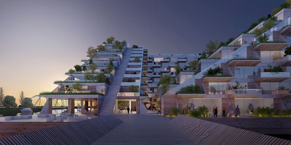 建筑四周环绕着长廊,并延伸到水里,串联起游艇码头、帆船学校、水上花园等,形成一个群岛。一条阶梯步道顺着建筑的坡度直达屋顶平台,人们可以登上建筑的置高点欣赏周边的景色。这个通道将住宅单位相互联系起来,力求在居民之间创造一个独特的社区氛围。