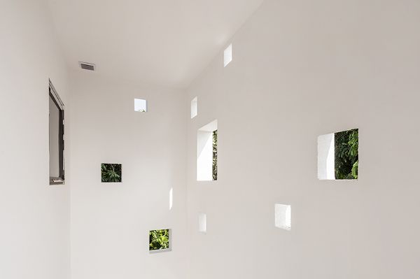 通过栽植树木的整合使周围空间协调、清晰来实现连续的内外审美。此外,Stu/D/O仔细布置洞口,让自然景观渗入居住区。从室外看,这些0.6*0.6m的方形开口均匀优雅地散布在墙上,角度变化的日光通过这些逐渐变细的空隙进入到房子内部。