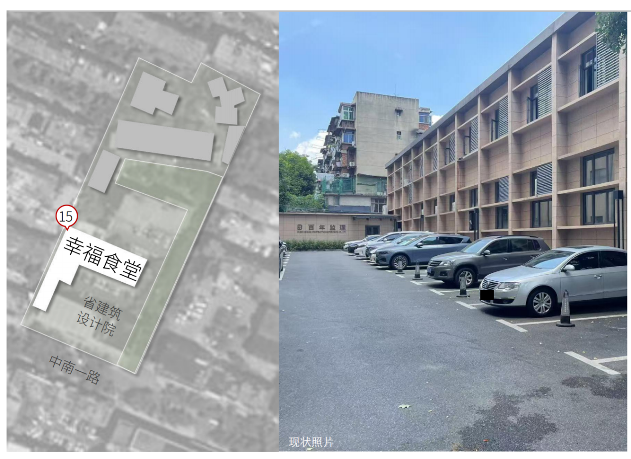 2、使用面积:幸福食堂位于中南一路66号湖北省建筑设计院内办公楼2号楼1楼,建筑面积629.65㎡。