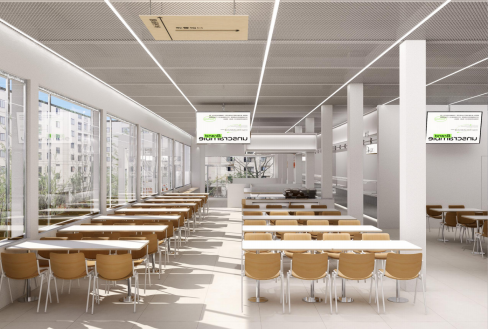 主要功能为餐厅,同时配备小卖部和独立档口,可供150人左右共同就餐。卫生间重新改造,原打印室位置改为连廊空间。餐厅后厨和就餐区面积约550平方米。