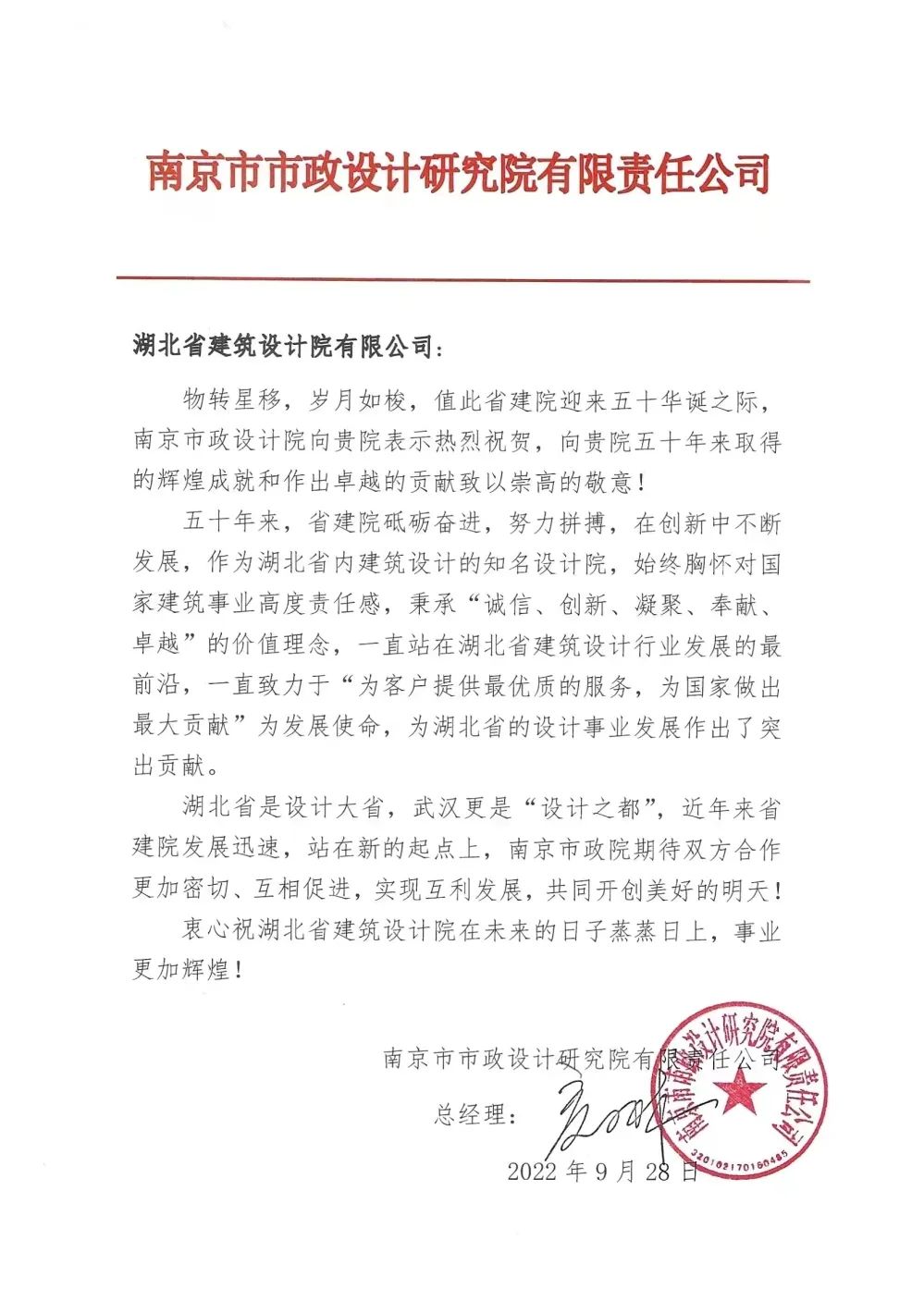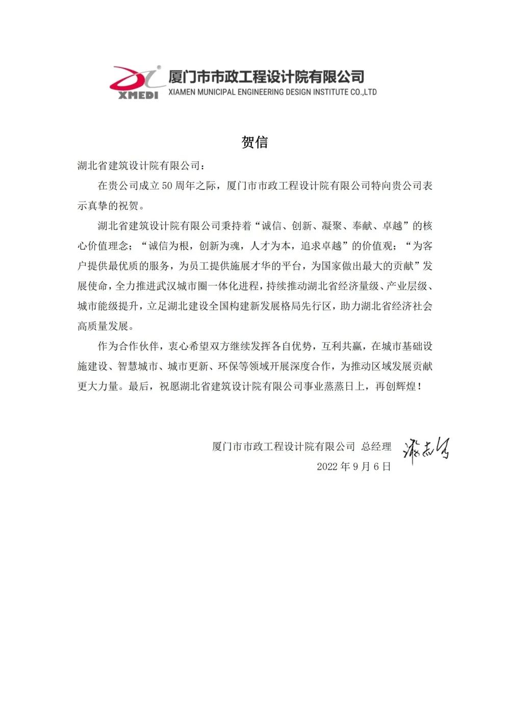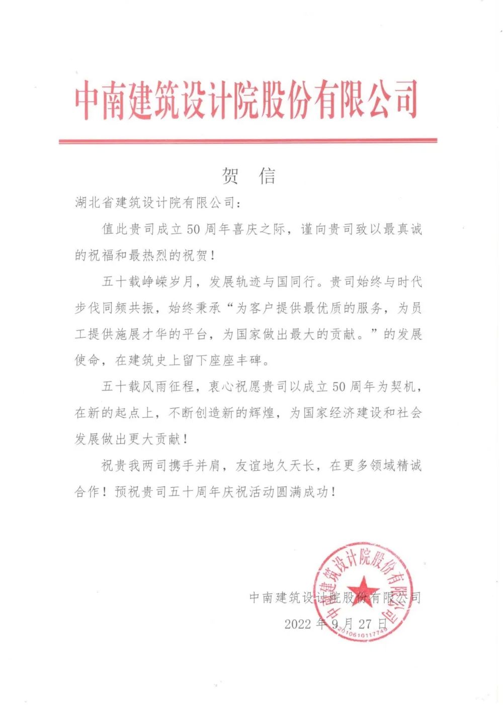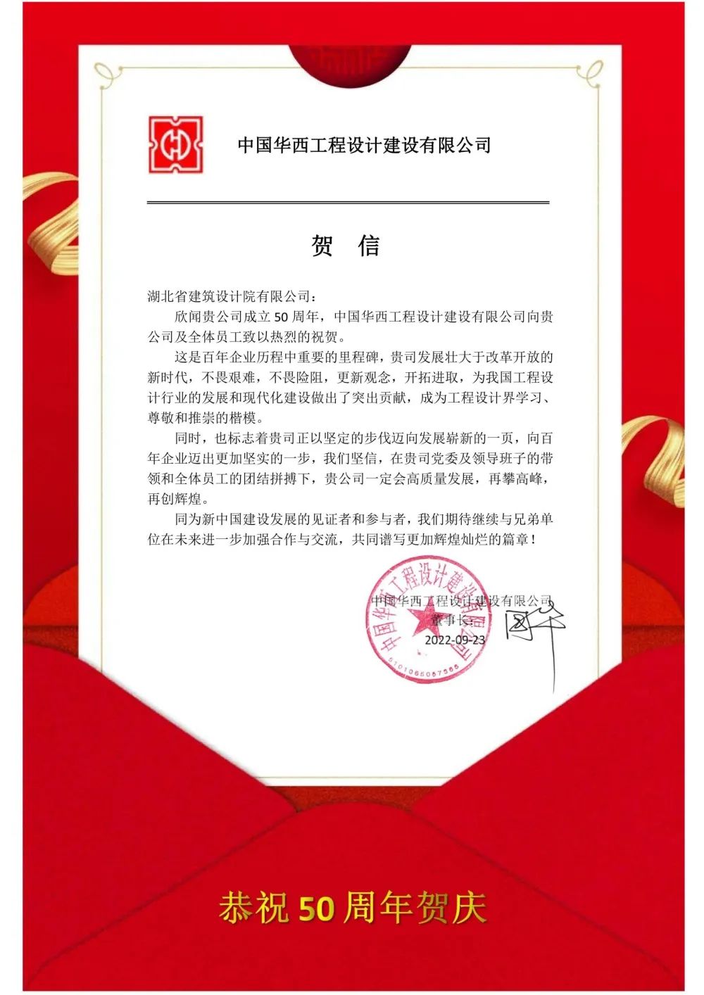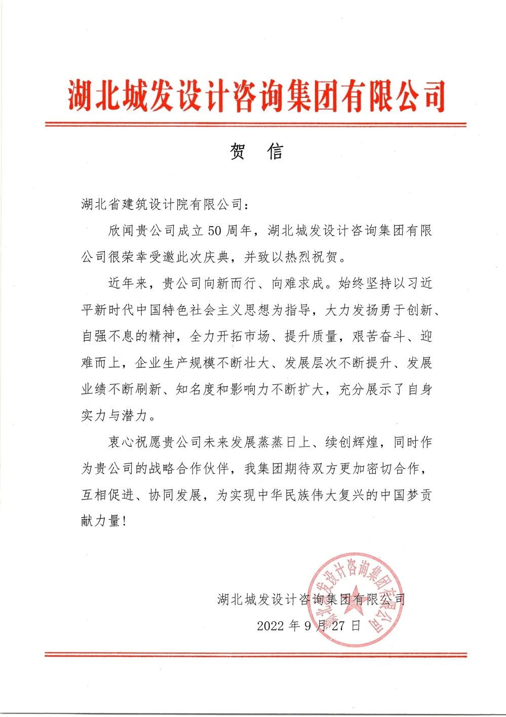 2022年是湖北省建筑设计院有限公司成立50周年。50载风雨兼程,50载硕果累累。广大合作伙伴与我们一起,在市场开发、技术攻坚、科研合作等多方面充分发挥各自优势,共同发展、资源互补、合作共赢,分享发展新机遇,共创发展新辉煌。