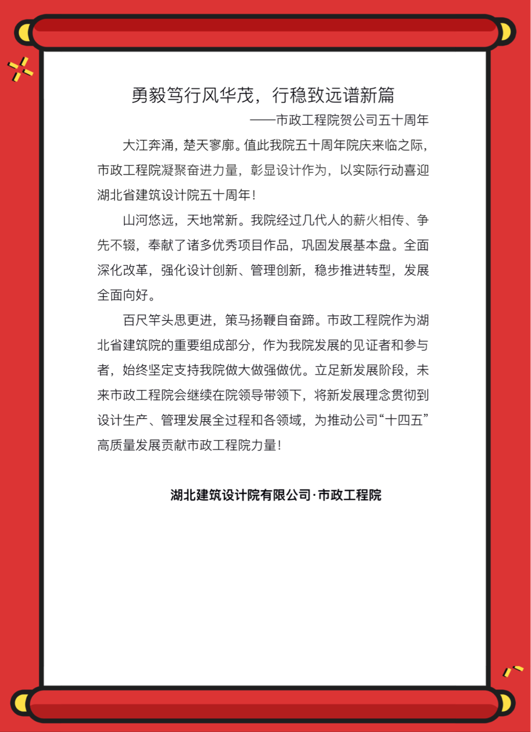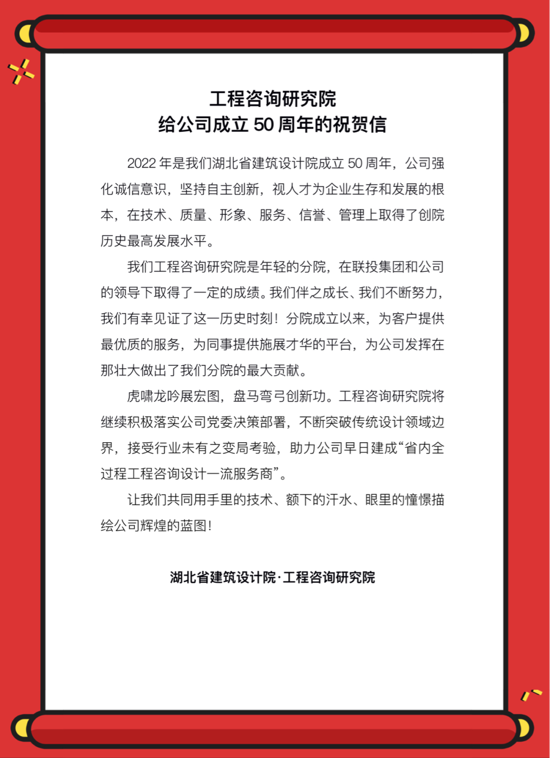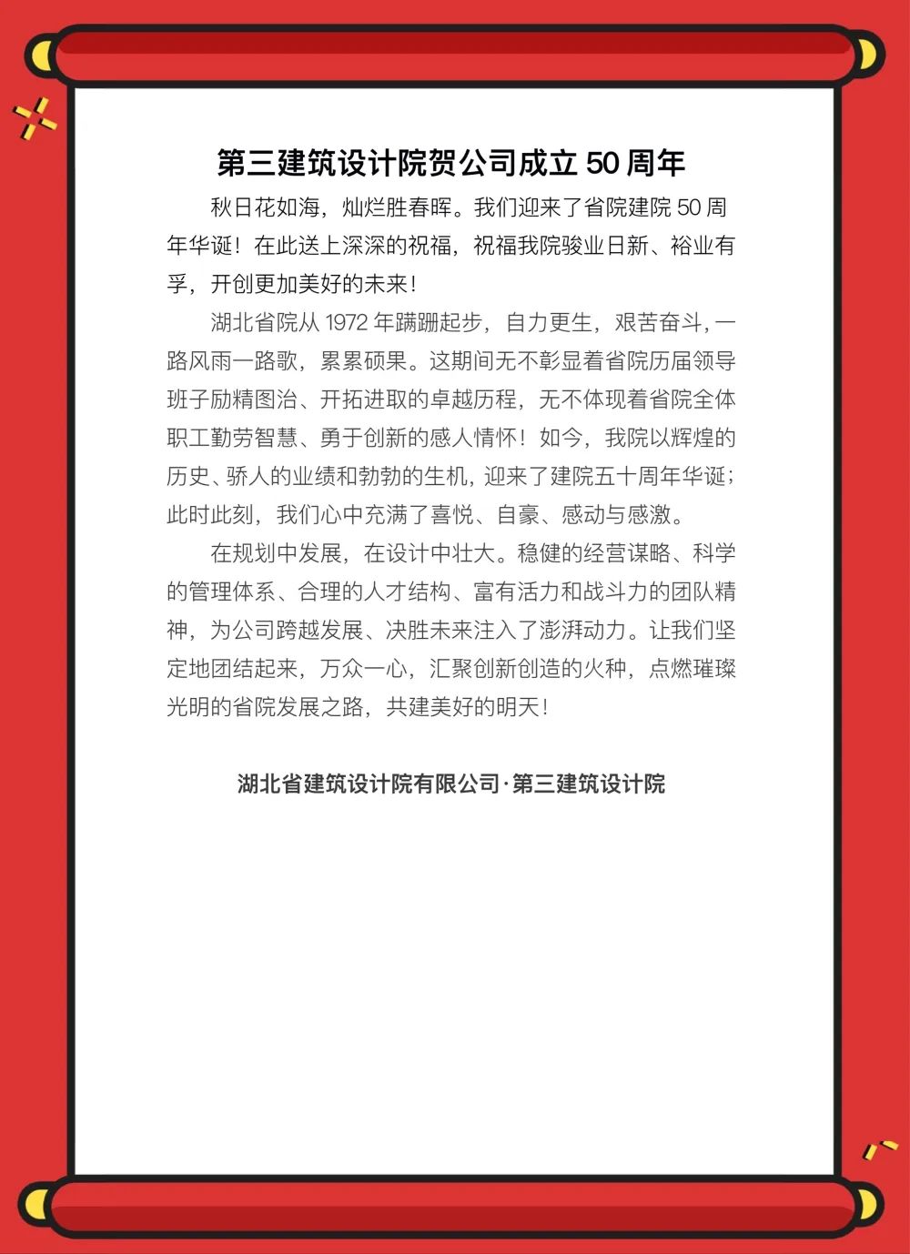 2022年,湖北省建筑设计院有限公司成立50周年。50载长歌奋进、50载砥砺前行,实现了省院从“标准设计站”到综合型设计院的华丽蝶变,省院的每一步,都烙上了艰辛与荣耀的印记,每一次蜕变都离不开一代代HBADI人的呕心沥血、奋发图强。